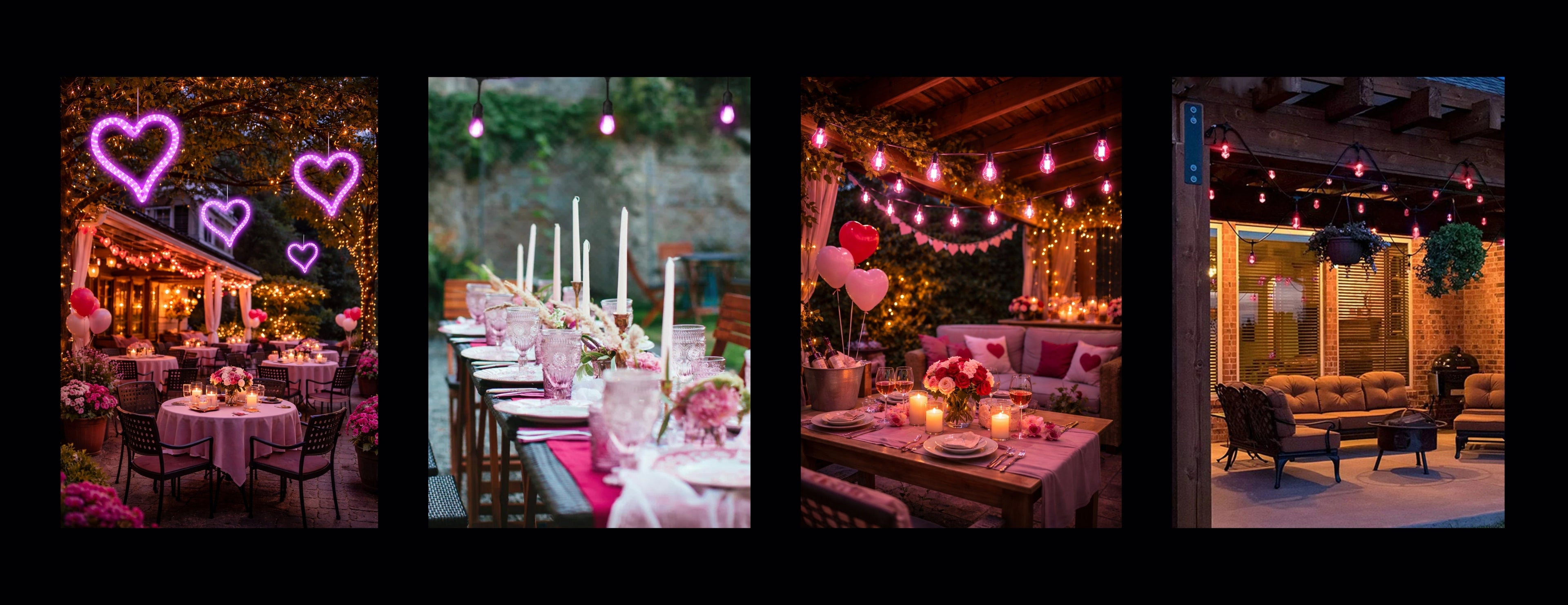 Create a space that glows with love. Add soft lights and romantic accents to patios, porches, and party spaces for an instant Valentine’s vibe.